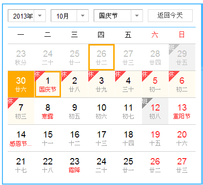 我公司2013年國(guó)慶節(jié)放假時(shí)間為:2013年10月1日—10月7日,10月8日(周二)正常上班。放假期間給您帶來(lái)的不便敬請(qǐng)諒解。