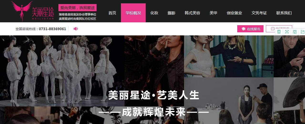 中虎營(yíng)銷與湖南較大的美業(yè)技能培訓(xùn)學(xué)校-美麗星途經(jīng)過(guò)一個(gè)月的接觸與深入溝通,最終美麗星途的選擇中虎營(yíng)銷負(fù)責(zé)該學(xué)校的PC與移動(dòng)端網(wǎng)站設(shè)計(jì)與制作,以及對(duì)外招生專題頁(yè)的設(shè)計(jì)。