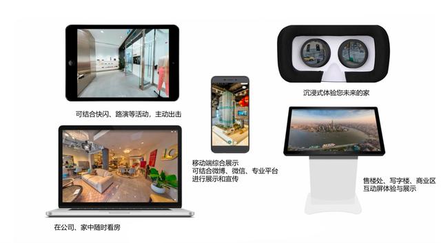 VR全景漫游可以在VR眼鏡、手機(jī)、iPad、PC、觸摸屏一體機(jī)等全終端顯示,線上線下結(jié)合,便于市場(chǎng)推廣和豐富銷售工具的全面性。