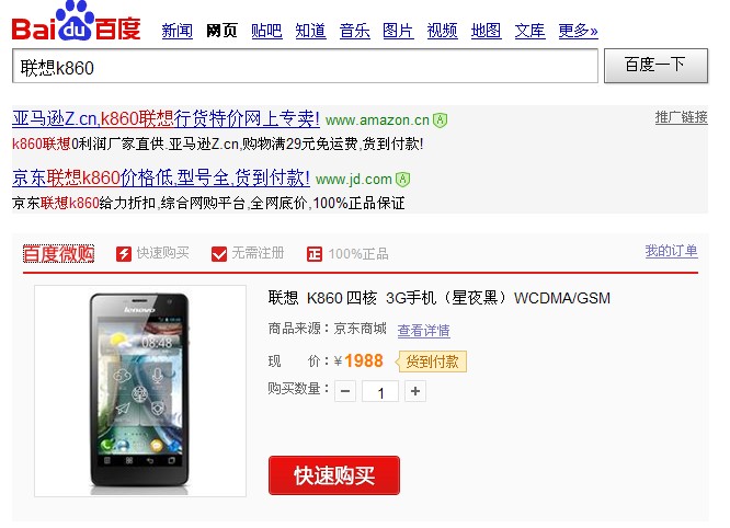 “百度微購(gòu)”是百度搜索結(jié)果頁(yè)的web應(yīng)用,應(yīng)用介紹寫道:“百度微購(gòu)為廣大用戶提供快捷購(gòu)買渠道,無(wú)需注冊(cè),快捷下單,貨到付款,省去繁瑣的注冊(cè)及支付流程。 微購(gòu)上所有商品均由國(guó)內(nèi)知名大型網(wǎng)上商城提供,正品保證!